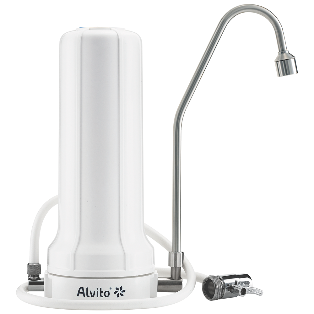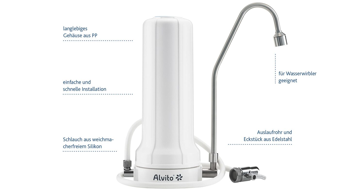 Der Alvito-Auftischfilter steht direkt neben dem Wasserhahn auf der Arbeitsplatte. Über dem Premium Flex-Silikonschlauch und einem Adapter für den Hahnanschluss wird er mit dem Wasserhahn verbunden.
