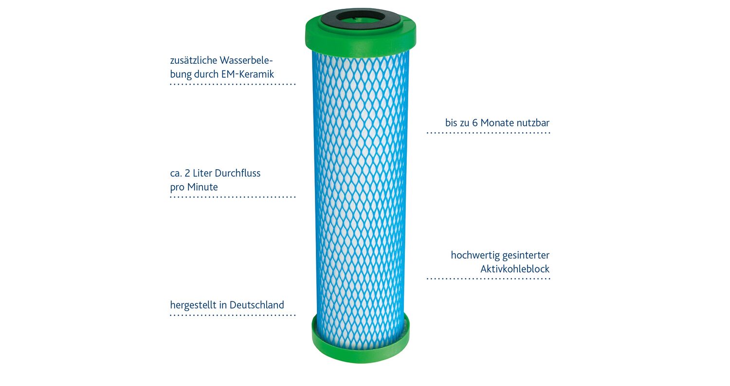 Trinkwasserfilter in Kombination mit EM-Keramik. Die Filtereinsätze von Carbonit werden aus hochwertiger und zertifizierter Aktivkohle hergestellt. Auf seinem Weg durch den gesinterten Kohleblock wird das Wasser mittels unzähliger feiner Kanälchen und Poren von verschiedensten Schadstoffen befreit. Kalzium, Magnesium und andere mineralische Ionen, die den Säurepuffer im Wasser bilden, bleiben dabei enthalten.